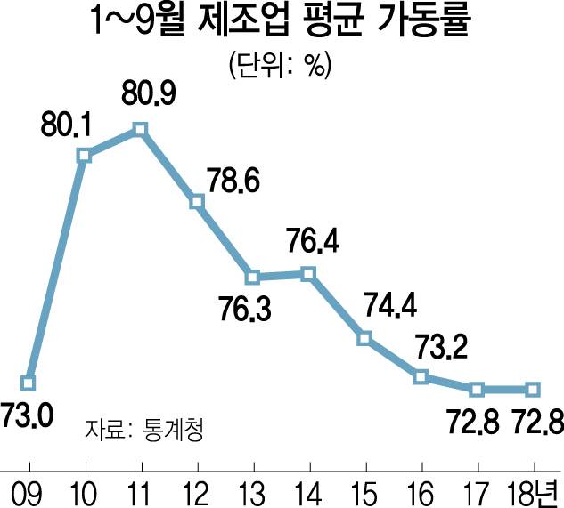 11일 통계청에 따르면 지난 1~9월 제조업 평균 가동률은 지난해와 같은 72.8%를 기록했다. 같은 기간 기준으로 1998년(66.8%) 이후 가장 낮은 수치가 2년째 이어지고 있다.