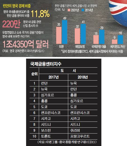 2008년 이후 런던은 뉴욕을 제치고 글로벌 금융 허브센터 1위 도시로 등극했다. 세계 금융의 판도는 런던이 어떻게 움직이느냐에 따라 달라졌다. 영국 경제 전문지 파이낸셜타임스가 분석한 바에 따르면 2001년 런던은 전 세계 금리 장외파생상품(OTC)의 35%를 책임졌고 해양보험의 32%, 국제 은행 대출의 18%, 헤지펀드 자산의 9%를 유치하고 있었다. 2014년 OTC의 경우 거의 절반에 해당하는 49%, 해양보험 41%, 국제 은행 대출 29%, 헤지펀드 자산 18%를 차지했다.