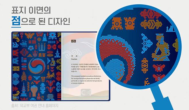 우선 표지 이면에는 우리나라를 상징하는 이미지와 문양이 다양한 크기의 점으로 표현됐습니다. 여기에는 전통미와 미래적인 느낌을 함께 담겨 있는데요. 지난 2007년 외교부와 문체부가 주관한 공모전 당선작을 기초로 한 이번 디자인은 전문가의 자문을 거쳐 수정·보완됐습니다.