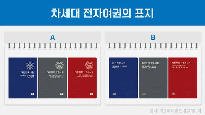외교부와 문체부가 공개한 차세대 전자여권의 디자인 시안은 크게 두 가지입니다. '대한민국 여권'이 표시되는 위치와 표지 문양에 따라 A안과 B안으로 나뉘는데요. 국민의견을 수렴해 두 가지 시안 중 한 가지가 새로운 여권의 표지로 최종 결정될 예정입니다.