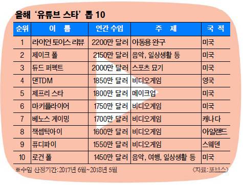 미국 경제전문매체 포브스는 3일(현지시간) 유튜브 장난감 소개 채널 ‘라이언 토이스 리뷰(Ryan Toysreview)’를 운영하는 7살의 일본계 미국인 소년 라이언이 지난해 6월부터 1년간 2200만 달러(약 224억원)를 벌어들여 수익 1위를 기록했다고 보도했다. 라이언의 채널은 2015년 3월 부모 도움으로 개설된 이래 260억 페이지뷰를 기록했다. 팔로워도 1731만명이나 된다. 대부분 라이언의 또래 친구들이다.