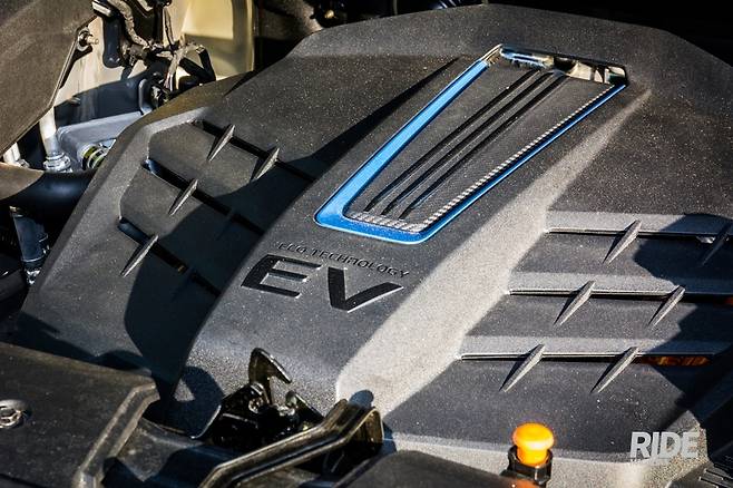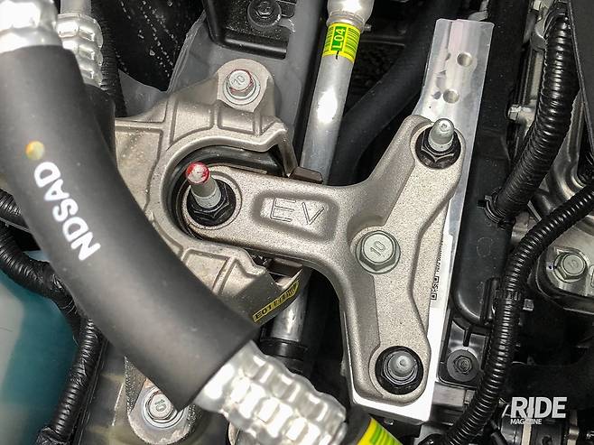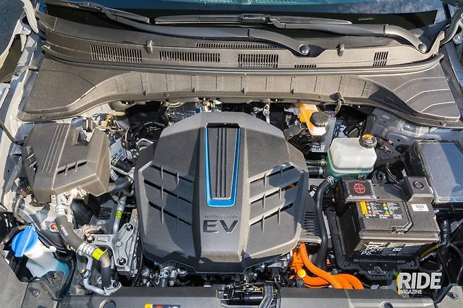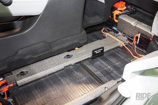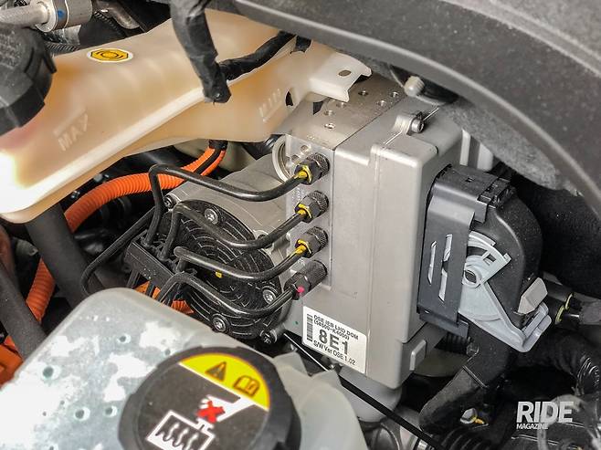 내연기관 차량이라면 달려있던 운전석 브레이크 진공부스터 자리에는 iEB, 통합 전자식 브레이크 제어시스템이 장착되었다. 전자식으로 브레이크 페달의 동작에 따라 네바퀴 각각의 브레이크를 조절한다. 브레이크 페달과 브레이크 캘리퍼의 피스톤과는 iEB를 거쳐 유압으로 연결되는 셈이다. 브레이크 부스터, ABS와 자세제어장치인 ESC가 통합되어있기 때문에 안그래도 엔진이 빠지면서 생긴 공간까지 더해 모터룸의 부품 배치는 무척 여유있게 되어있다. 한가지 불만인 것은 브레이크의 작동 정도를 구현해주는 브레이크 시뮬레이터가 전혀 작동하지 않는 느낌이었다. 제동을 위해 브레이크 페달을 밟으면, 점차 강하게 밀어낸다거나 하는 느낌이 있어야 하는데, 속도가 빠르던 느리던 강도에 차이가 없다. 작동 초반에는 푹 들어가다가 끝에서 강하게 반발이 되는데, 평소 감각과 달라 무척 어색하다. 서보모터를 부스터로 이용하는 타사의 하이브리드 차량에서는 초반 밟는 느낌만 차이날 뿐, 브레이크 동작 자체는 동일한 반응이었다. 전자식 브레이크는 확실히 장점이 많지만, 시뮬레이터로 리스폰스가 구현되지 않는 페달이라면 게임용 레이싱 휠의 플라스틱 페달과 다를 바가 없다.