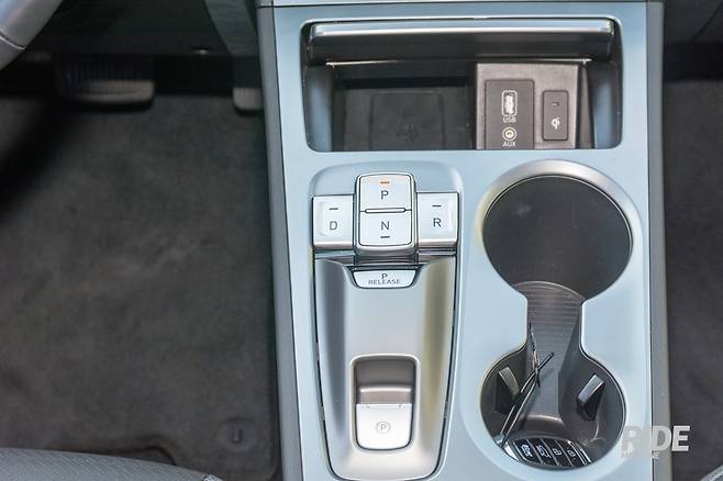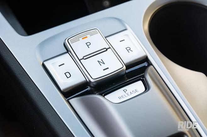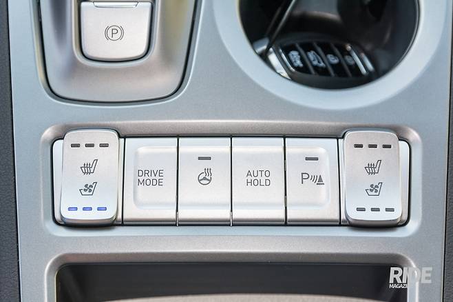 전자식 변속 버튼 아래쪽에는 통풍-열선 시트 제어버튼, 드라이브 모드 버튼, 스티어링 온열버튼, 오토홀드, 장애물 감지 기능 버튼이 있다. 드라이브 모드 버튼이 가장 왼쪽이 아닌 것이 좀 아쉽다. 공간이 부족한 소형차에서 버튼을 배치할만한 곳이 확실히 부족하긴 하다. 변속 버튼 옆에는 컵홀더가 두 개 있다.