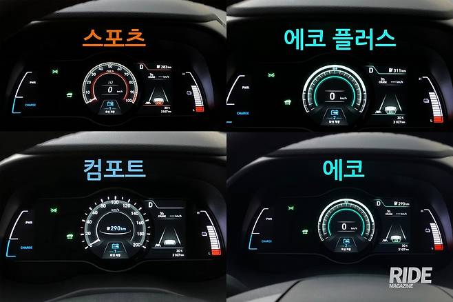 드라이브 모드는 4가지로 나뉜다. 에코, 에코 플러스, 컴포트, 스포츠. 에코모드에서는 가운데가 디지털 속도계로 바뀌고, 가속을 최대한 적게 하도록 페달 반응이 더뎌진다. 3단계로 조절 가능한 회생제동 기능은 2단계로 설정된다. 드라이브 모드 버튼을 꾹 누르고 있으면 에코 플러스로 바뀐다. 에코 플러스는 공조기까지 꺼버리면서 최대한 전기를 아끼는 드라이브 모드다. 속도를 줄여서 회생제동에 들어가거나 하면 +4 km, 가속 페달을 밟으면 -10 km등 주행가능거리의 변화량을 알려준다. 컴포트는 회생제동 1단계가 설정되고 가운데 주행가능 거리를 표시하며 테두리에는 속도계 다이얼이 나타난다.