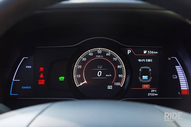드라이브 모드를 스포츠로 전환하면 가운데에 숫자는 디지털 속도계로 바뀌고, 테두리는 모터 출력을 퍼센트로 나타낸다. 90-100%에는 내연기관의 레드존처럼 붉은색으로 표시되어 있고, 회생제동은 1단계로 바뀐다. 또 스티어링휠이 무거워지면서 본격적으로 달리기 준비를 마친다. 기자는 스포티한 주행을 위해, 회생제동 스위치를 3단계로 바꿔서 좀 더 적극적인 회생제동이 걸리도록 만들었다.