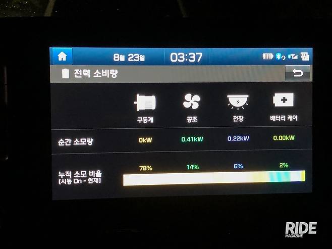 코나 일렉트릭에서 기대하는 부분은 전기차들에 기대하는 것과 크게 다르지 않다. 크게 두 가지로 나뉘는데 첫째는 1회 충전으로 이동할 수 있는 거리, 둘째는 높은 토크의 시원한 가속감과 조용한 실내이다. 미국 EPA는 물론, 국토교통부가 코나 일렉트릭을 타고 1회 충전만으로 서울-부산을 갈 수 있음을 공식 인정했다. 중요한 건 두 번째, 토크와 정숙성이다. 일단 통풍시트와 공조기를 끄면 조용하게 타이어 굴러가는 소리가 나지막히 들려온다. 오히려 다른 차들의 소음이 더 크게 들려온다. 모터룸을 보면 소음방지재가 씌워져 있던데, 모터소음은 억제했지만 차음은 소형차라 별로 신경쓰지 않은 듯 하다. 그래도 비가 오는 와중에 토독토독 비오는 소리를 들으며 조용히 주행하고 있으니 신선이 된 기분이다.