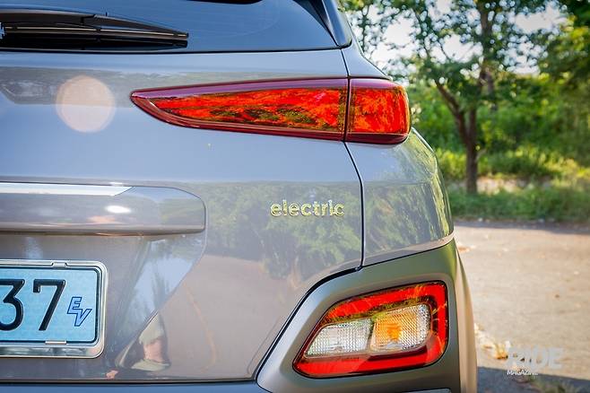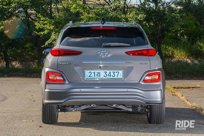 뒤쪽을 살펴보면 범퍼 형상에 물결모양의 두 줄을 넣었다. 기존 범퍼와 비교해볼 때 공기역학적인 효과를 노린 것으로 보인다. 통합형 후진등 겸 방향지시등은 노란색 방향지시등 커버를 클리어 색상으로 바꾸고 전구색을 노란색으로 바꾸었다. 기존의 격벽으로 후진등과 분리된 형상이였다면, 코나 일렉트릭은 검은 선으로 커버 구분만 되어있을 뿐, 후진등과 일체감을 주면서 ㄷ자 형태의 리플렉터를 강조했다.