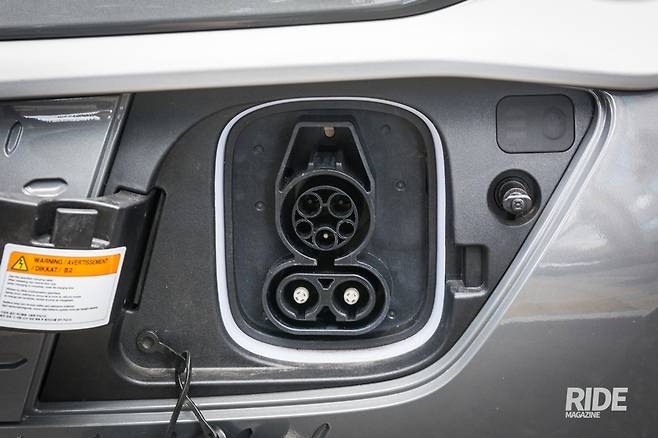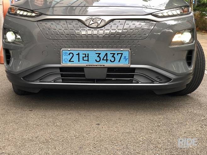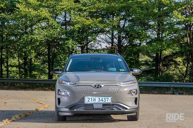 앞모습을 보면 기존 코나에서 강렬한 인상을 만들며 비교적 잘 어울리던 상단 얇은 그릴과 중앙의 도자기를 닮은 캐스캐이팅 그릴이 삭제됐다. 내연기관이 아닌 만큼 에어컨, 배터리와 모터 냉각은 아래쪽에 위치한 공기 흡입 홀로 충분해 보인다. 그릴이 사라진 자리에는 충전포트가 자리 잡았다. 충전 인터페이스는 2018년 신차부터 표준으로 지정된 DC콤보를 사용한다. 전방 충전포트는 측면에 있을 경우보다 방향에 구애를 덜 받는 장점이 있지만, 전방주차를 잘 못하는 기자는 무척 애를 먹었다. 윈드실드 상단에는 긴급제동시스템과 운전자 주행 보조를 위한 모노카메라가, 번호판 하단부에는 차간 거리를 측정하는 레이더가 장착됐다.