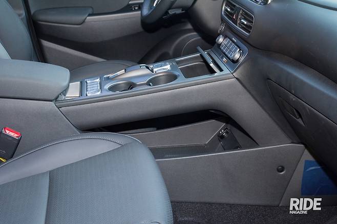 일반 코나와 다른 점은 우선 변속기가 위치하던 센터 터널이 사라지고, 버튼식 변속기와 각종 조작버튼이 높게 장치됐다. 이는 넥소에서 먼저 보여준 디자인이기도 하다. 기존에 없던 디자인인 만큼 이미 미래에 온 것 같은 착각을 하게 된다. 센터터널 하부에 위치한 두 개의 12 V 아웃렛 또한 넓직한 여유공간이 생긴 덕에 수납 외에도 휴대기기 충전 같은 다양한 용도로 활용할 수 있게 되었다.