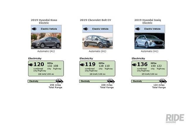 미국 환경보호청(EPA)에서 측정하는 친환경차 연비테스트에서도 코나 일렉트릭이 258 마일(415 km)로 소형 전기차 중 가장 긴 주행거리를 보였다. EPA 테스트 결과에서 재밌는 점을 찾았는데 바로 아이오닉 일렉트릭의 전비이다. 아이오닉 일렉트릭의 경우 배터리가 작아서 1회 충전으로 갈 수 있는 거리는 124 마일(199 km)로 짧지만, 시판 전기차 중에서는 가장 높은 전비(電比)를 나타냈다. 아이오닉 일렉트릭이 100 마일(161 km)을 주행하는데 요구되는 에너지는 25 kWh로 가장 낮았다. 코나 일렉트릭은 28 kWh/100 mile 이였다.