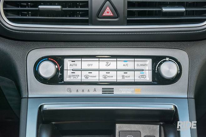 공조기 부분은 온도조절을 위한 노브와 버튼들이 은색으로 바뀌고 크기가 작아졌다. 넥소의 디자인과 동일하지만, 비상등 버튼 위치는 통풍구 사이 그대로다. 공조기 상태를 표시하던 작은 LCD창은 사라지고 버튼들로 채워졌다. 내부 순환과 에어컨 동작상태를 표시하는 푸른색 LED는 깨끗하면서도 하이테크적인 느낌을 잘 살렸다. 클라이메이트(CLIMATE)버튼을 누르면 인포테인먼트에서 여러번 앱을 실행하지 않고 한 번에 공조기 상태를 확인할 수 있도록 했다. 공조기 아래쪽에는 조수석과 뒷좌석 안전벨트 경고등이 자리잡았다.