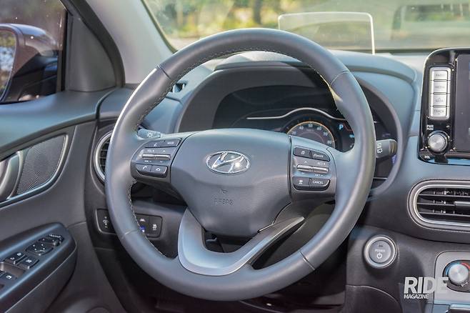 스티어링 휠은 비교적 아담하다. 좌측에는 미디어 재생 관련버튼들이, 우측은 주행보조 관련 기능 버튼들이 있다. 계기판의 메뉴와 차량 주행보조기능 설정 또한 스티어링 휠의 메뉴버튼을 통해 조작할 수 있다. 스티어링 휠 뒤쪽에는 패들버튼이 있는데, 변속기가 없는 코나 일렉트릭에서는 회생제동 강도를 조절하는 버튼으로 쓰인다.