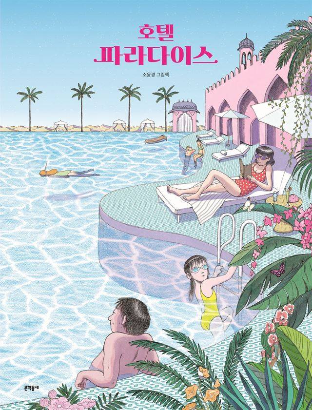 소윤경 작가의 신작 그림책 ‘호텔 파라다이스’에는 대형 판형 그득히 그야말로 꿈인 듯 비일상적이고도 호화로운 호텔 이미지가 펼쳐진다. 꽃 덩굴 늘어진 호텔 리조트 수영장은 수영을 즐기거나 그저 물속에 몸을 담그고 있거나 비치 파라솔 아래서 책 읽는 이들이 띄엄띄엄 한적한데, 표지의 위쪽 끝은 야자수 너머 모래 사막이다. 그 사막 위 푸른 하늘을 배경으로 진한 핑크빛 홀로그램 압인(壓印)으로 후가공한 제목 ‘호텔 파라다이스’가 반짝인다.