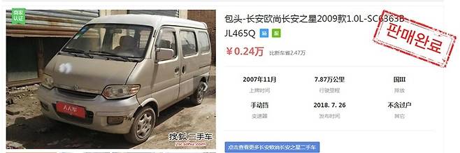 장안 오우샹자동차의 2007년 11월식 8만km 주행한 승합차다. 국내 중고차 사이트에 가보면 중국 승합차 조건과 유사한 차량 가격은 최소 1000만원이다. 이에 비하면 중국 중고차의 가격은 터무니 없이 저렴하다고 볼 수 있다.