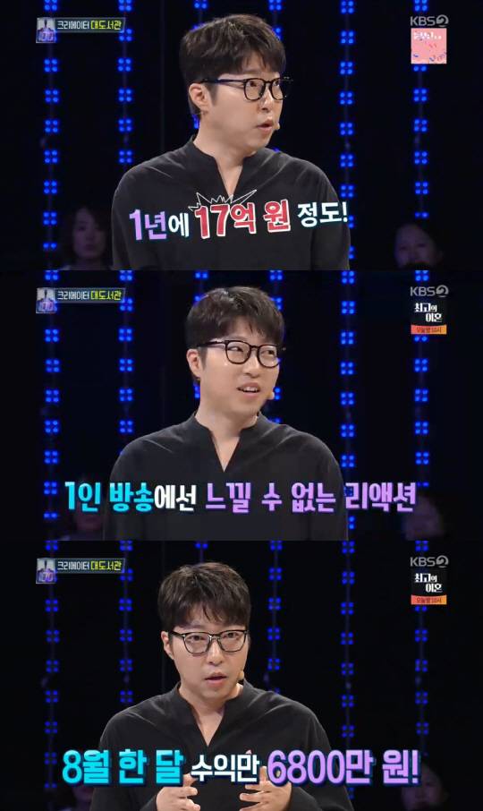 이날 대도서관은 1인 방송으로 얻는 수입에 대해 묻자 "1년에 약 17억 원 정도 개인적으로 번다"고 답했다.