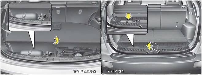 현대 싼타페와 맥스크루즈, 기아 쏘렌토와 모하비, 쉐보레 캡티바 등 7인승 SUV들은 대부분 트렁크 바닥에 소화기를 비치합니다. 트렁크 바닥 덮개를 열면 그 안쪽에 비치된 차량용 소화기를 확인할 수 있습니다. 7인승 수입 SUV도 예외 없이 소화기를 설치해야 하는데 대부분 비슷한 구조로 트렁크 바닥에 있습니다.