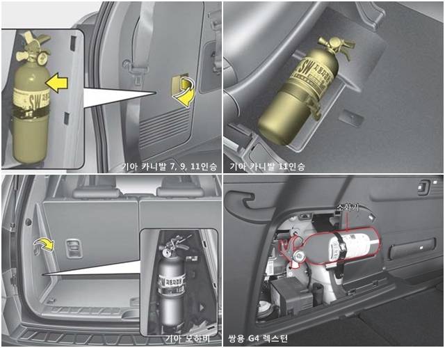 트렁크 바닥을 다른 용도로 쓰는 미니밴과 프레임 보디 타입의 7인승 SUV들의 경우엔 트렁크 좌측 혹은 우측 벽면을 사용합니다. 기아 카니발이 대표적인데 4열 시트를 바닥으로 숨기는 구조이기 때문에 소화기를 벽면에 두고 있습니다. 11인승의 경우에는 프런트 시트 쪽에 하나 더 존재합니다. 7인승 SUV 중에서 기아 모하비와 쌍용 G4 렉스턴은 프레임 보디 타입이라 트렁크 바닥 공간의 활용성이 떨어지죠. 해서 이 둘은 소화기를 트렁크 벽면에 두고 있습니다.