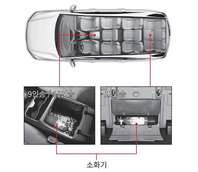 쌍용 코란도 투리스모의 소화기 위치는 조금 독특합니다. 9인승은 센터 콘솔 하단에 두었고 11인승은 센터 콘솔 하단과 마지막 열 시트에 각각 소화기를 비치하고 있습니다. 현대 스타렉스에 비치된 소화기는 운전석 시트와 발판 사이의 덮개를 열어 확인할 수 있다.