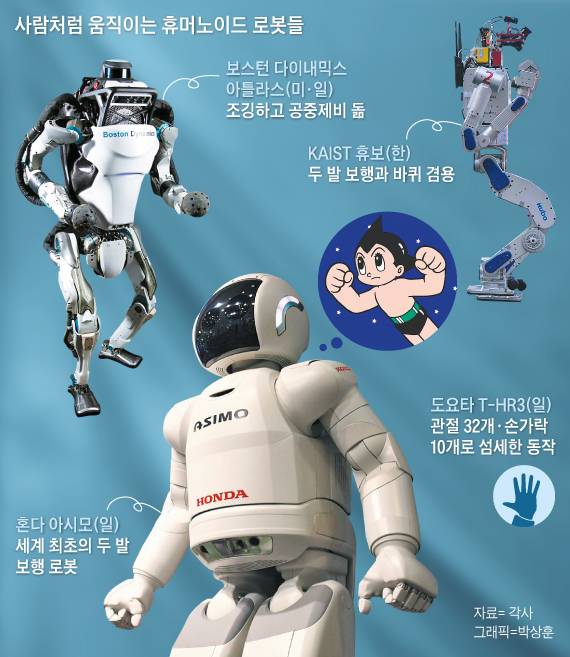 2000년 11월 일본 자동차 회사 혼다가 신형 로봇을 공개했다. 아시모(ASIMO)라는 이름이 붙여진 키 120㎝, 무게 52㎏의 이 로봇은 등에 배낭(배터리팩)을 멘 모습 때문에 마치 등교하는 초등학생을 연상케 했다. 아시모는 사람의 형태를 갖추고 두 발로 안정적으로 걸을 수 있는 최초의 로봇이었다. 아시모는 당시 로봇이라면 생산 공장에서 제품을 조립하는 한팔 로봇이나 장난감 로봇만 떠올리던 사람들에게 엄청난 충격을 줬다. 아시모의 탄생을 지켜본 전 세계 과학자들은 사람과 똑같은 로봇을 만들 수 있다는 희망을 갖기 시작했다. 이후 한국과학기술원(KAIST)이 휴보(HUBO), 보스턴 다이내믹스가 아틀라스(ATLAS)를 만들었고, 도요타·소프트뱅크 등도 인간형 로봇(휴머노이드) 개발에 뛰어들었다.