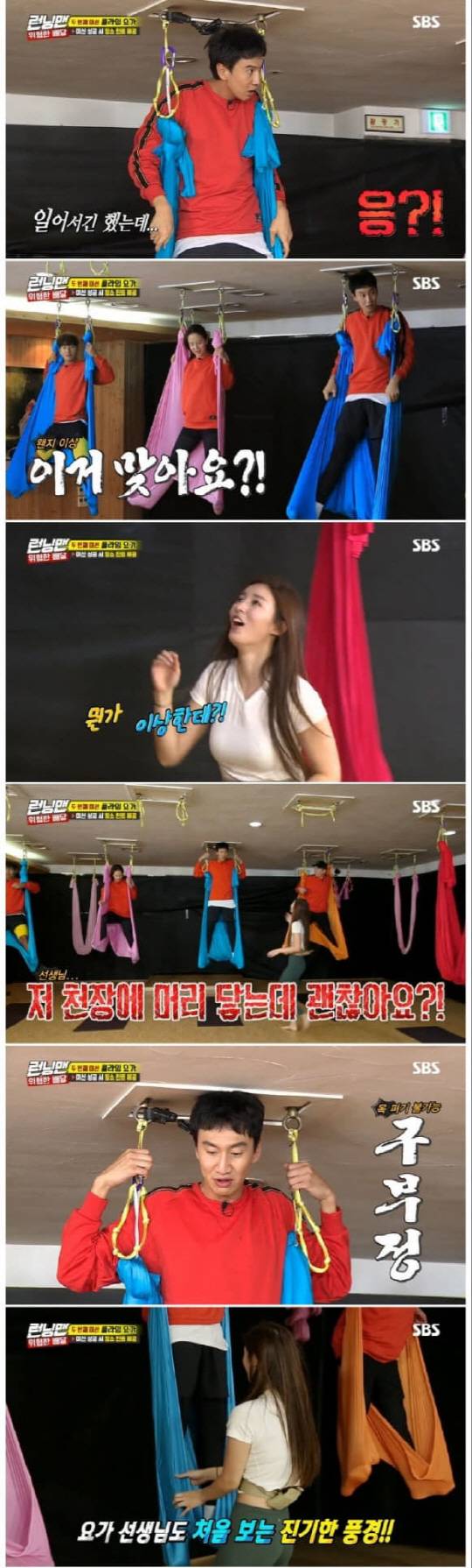 김종국은 플라잉 요가 첫 도전이었음에도 불구하고 의외의 유연성을 자랑하며 고난도 동작을 보는 즉시 소화해 내 모두를 놀라게 했다. 반면, 런닝맨 대표 '몸치' 이광수는 김종국과 비교되는 어설픈 동작들로 폭소를 자아냈다.