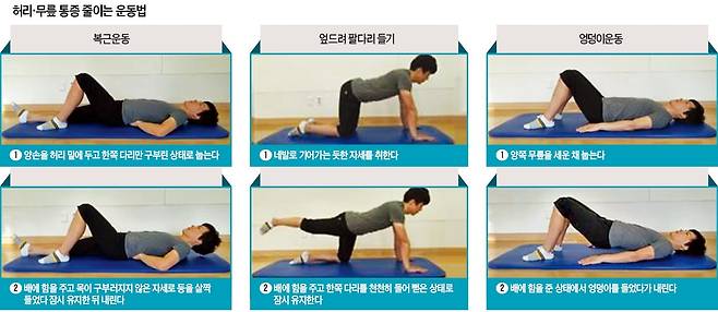 복근 운동도 도움이 된다. 양손을 허리 밑에 두고 한쪽 다리만 구부린 상태로 눕는다. 배에 힘을 줘 몸통 근육을 단단하게 하고 목이 구부러지지 않은 자세로 등 부분을 살짝 들었다 잠시 자세를 유지한 뒤 내린다. 이때 허리가 손을 누르지 않도록 하고 숨은 편안히 쉰다. 허리를 구부리지 않고 가슴을 살짝 든다는 느낌으로 하면 된다. 통증이 생기지 않는 범위에서 천천히 10~20번 정도 반복한다. 엉덩이 들기 운동은 허리 근육과 엉덩이, 허벅지 근육을 강화해준다. 양쪽 무릎을 세운 채 누워 배에 힘을 준 상태에서 엉덩이를 들었다가 내린다. 호흡은 편안히 하고 통증이 느껴지지 않는 범위만큼 엉덩이를 들어야 한다. 천천히 10~20번 정도 반복하면 된다. 엎드린 자세에서 다리를 교대로 들었다 내렸다 하는 운동도 좋다. 허리 근육뿐 아니라 엉덩이, 등 근육도 키울 수 있다. 네발로 기어가는 듯한 자세에서 배에 힘을 주고 한쪽 다리를 천천히 들어 뻗은 채 유지하다 내린다. 자세가 익숙해지면 다리와 반대쪽 팔도 함께 들어 뻗는다. 팔다리를 들어올릴 때 높이는 중요하지 않다. 몸통이 흔들리지 않도록 허리 자세를 유지하는 데 더 신경써야 한다.