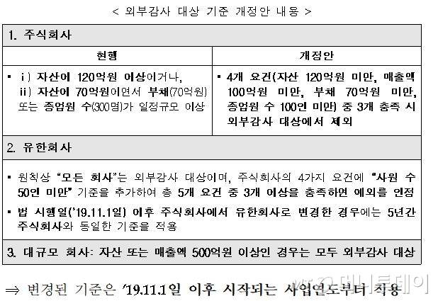 아울러 외부감사 적용 기준과 무관하게 매출 혹은 자산이 500억원 이상인 회사에 대해선 외부감사를 받도록 규정한 것도 이번 개정안의 특징이다.