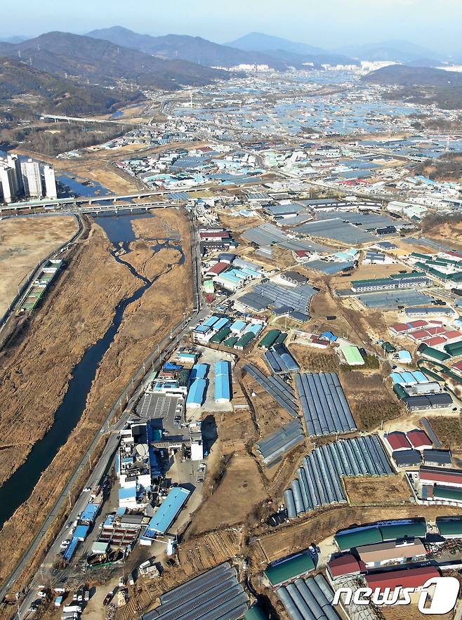 정부 방안에 따르면 국토교통부는 3기 신도시의 대규모 택지(100만㎡ 이상)로 남양주·하남·인천계양·과천을, 중소형 택지(100만㎡ 이하)로 6곳을 선정했다. 10만㎡ 이하인 소형택지는 31곳이다. 사진은 이날 3기 신도시 부지로 발표된 경기도 남양주 왕숙1지구 일대전경. 왕숙1지구는 경제중심도시로 개발되며 왼쪽에 보이는 왕숙천에는 왕숙천변로가 신설된다. 2018.12.19/뉴스1