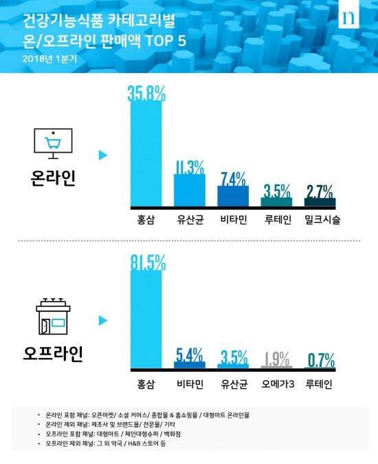 온·오프라인 채널에서 가장 많이 팔린 제품은 홍삼이었다. 각 채널에서 가장 많이 판매되는 톱 5 제품군을 분석해본 결과 온라인에서는 홍삼(35.8%), 유산균 (11.3%), 비타민 (7.4%), 루테인 (3.5%), 밀크시슬 (2.7%) 순으로 판매됐다. 오프라인 채널에서는 홍삼이 81.5%로 온라인 보다 판매 비중이 훨씬 더 높았다. 이어 비타민 (5.4%), 유산균 (3.5%), 오메가3(1.9%), 루테인 (0.7%) 등으로 톱 5 제품군의 순위와 판매 비중이 조금 다르게 나타났다.