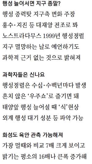오히려 천문학자들은 행성이 일렬로 늘어섰을 때를 기다리기도 한다. 최영준 한국천문연구원 우주과학본부장은 "우주에서 벌어지는 행성 직렬 현상은 그저 흔치 않게 발생하는 '우주쇼'인 만큼 즐기면 된다"고 말했다.