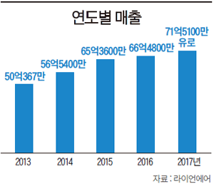 라이언에어의 지난해 매출은 전년 대비 7.6% 늘어난 71억5100만유로(약 9조3000억원), 영업이익은 9.6% 증가한 16억1100만유로(약 2조1000억원)였다. 매출과 영업이익 모두 사상 최대였다. 영업이익률은 23%로 2005년 이후 가장 높았다.