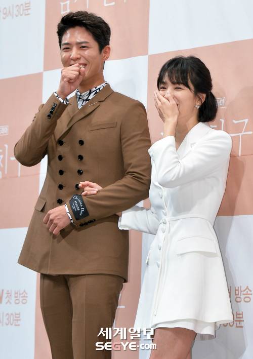배우 박보검(왼쪽)과 송혜교가 21일 오후 서울 강남구 논현동 임피리얼팰리스서울 호텔에서 열린 tvN 새 수목드라마 ‘남자친구’의 제작발표회에 참석해 포즈를 취하고 있다.