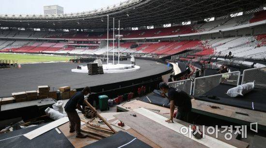 '2018 인도네시아 장애인아시아경기대회' 개막을 하루 앞둔 5일 오전(현지시각) 개막식이 열릴 인도네시아 자카르타 겔로라 붕 카르노(GBK) 주경기장에서 관계자들이 행사 준비로 분주한 모습을 보이고 있다. /자카르타=사진공동취재단