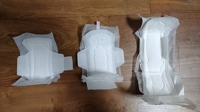 | ▲ 생리대도 종류가 많다. 양에 따라 다르고, 시간에 따라 다르다. 생리 양이 적은 날, 중간인 날, 많은 날부터 밤에 하는 생리대까지 다양하다. 어쩔 수 없이 일회용 생리대를 써야한다면, 성분을 확인하고 내 피부에 맞는 생리대를 찾는 것이 중요하다. 종류별로 꺼내서 아이에게 보여줘 봤다. |