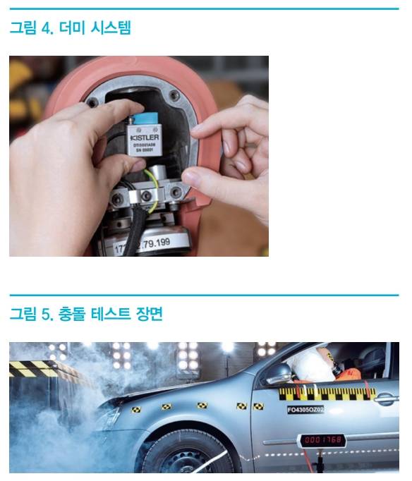 도로 교통량 증가 및 자율주행에 대한 관심이 커짐에 따라 자동차 관련 안전요구가 날로 엄격해 지고 있는 실정이며 특히, 충돌 시험은 자동차의 안전성을 개선하고, 승객 부상 위험을 획기적으로 줄이는 데 중요한 평가 방법이다. 따라서 충돌시험시 충돌 전, 충돌 중 혹은 충돌 후의 정확한 데이터 확보가 무엇보다도 중요하다. <그림 4>와 같은 충돌 테스트용 인체 모형에서는 차량의 사고 시 발생하는 충돌 및 충격에 대해, 상해 요인으로 작용하는 가속도, 모멘트 및 힘 등을 측정하는 센서에 압전 소자가 적용 되며 <그림 5>와 같은 차량 충돌 테스트에서도 차체에 가해지는 가속도, 모멘트 및 힘의 정밀한 측정에 적용된다.