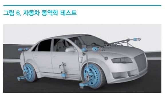 <그림 6>과 같은, 도로 주행조건 및 차량 하중에 따른 자동차의 동역학 측정 테스트는 차량의 개발 및 품질 개선에 필수적인 검증 항목이다. 이 시험에서 자동차의 제동거리 측정, 원형 코스 주행의 안정성 여부 확인 및 이중 차선 변경 시험 등을 진행하게 된다. 이를 검증하기 위해서는 하중에 따른 휠 포스를 측정할 수 있는 센서와 속도를 측정할 수 있는 광센서, 차체의 위치를 측정할 수 있는 레이저 센서, 조향장치 작동에 따른 휠 거동을 측정할 수 있는 기계적 센서 등이 필요할 뿐만 아니라 Dynamic 시험 조건에 따른 센서의 견고한 내구성이 추가로 확보되어야 한다. 최근에는 무선 휠 토크센서가 자동차의 제동성능 및 연비 측정에 사용이 되고 있다.