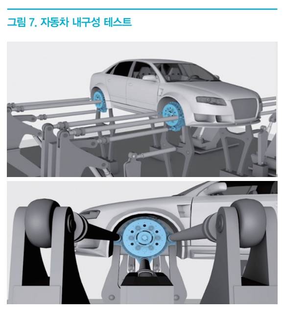 <그림 7>은 자동차 내구성 시험 장면을 보여주고 있다. 보통 내구성 테스트의 경우에는 실차 시험과 시뮬레이터를 이용한 실내 시험의 두 종류가 있으며, 개발 자동차의 내구성을 점검하고 품질을 개선하는 데 그 목적이 있다. 이를 위한 휠 포스 측정은 스트레인 게이지를 이용한 센서를 사용한다.