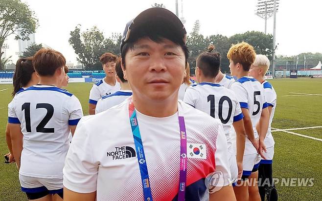(자카르타=연합뉴스) 신창용 기자 = 지난 28일(현지시간) 인도네시아 자카르타의 겔로라 붕 카르노(GBK) 럭비장에서 한국 여자럭비 대표팀 조성룡 감독이 연합뉴스와 인터뷰하고 있다. 2018.8.29