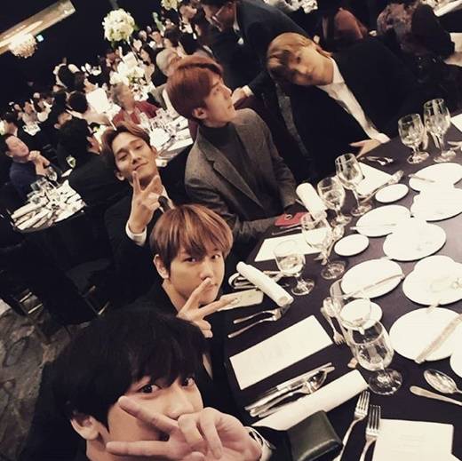 공개된 사진은 찬열 누나 박유라 아나운서 결혼식장에서 포즈를 취한 찬열, 백현, 첸, 세훈, 카이 모습을 담고 있다.