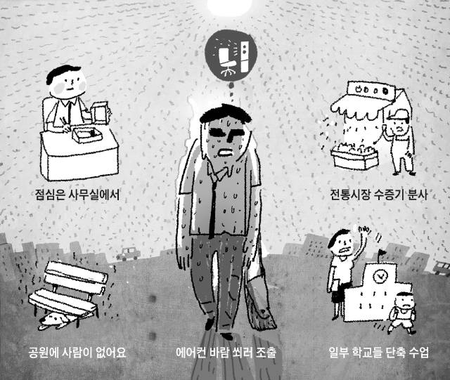 낮에는 폭염특보, 밤에는 열대야가 이어지면서 직장인과 학생들의 생활에도 영향을 미치고 있다. 직장인들은 "더운 집보다 시원한 회사가 낫다"며 일찍 출근하고, 학생들도 등교 시간보다 한 시간씩 일찍 학교에 나온다. 사람들의 동선(動線)이 바뀌면서 음식점, 전통시장도 희비(喜悲)가 갈린다.