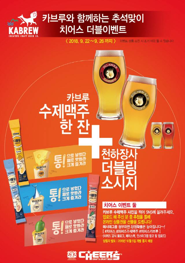 치어스 공식 네이버 블로그와 인스타그램, 페이스북에 자신이 좋아하는 카브루 수제맥주를 소개하는 내용의 댓글과 사진을 올리면 추첨을 통해 스타벅스 커피쿠폰, 해피머니 모바일 상품권, 베스킨라빈스 파인트 상품권 등을 증정하는 이벤트다. 치어스 매장에서 찍은 카브루 수제맥주 사진과 함께 #치어스카브루 #치어스 등 특정 해시태그를 첨부하면 당첨확률이 더 높아진다. 당첨자는 10월 5일 개별 발표될 예정이다. 또 추석연휴 기간인 23일부터 26일까지 치어스 매장에서 카브루 맥주를 드시는 고객 대상으로 천하장사 더블링 소세지를 증정하는 이벤트도 함께 진행된다.