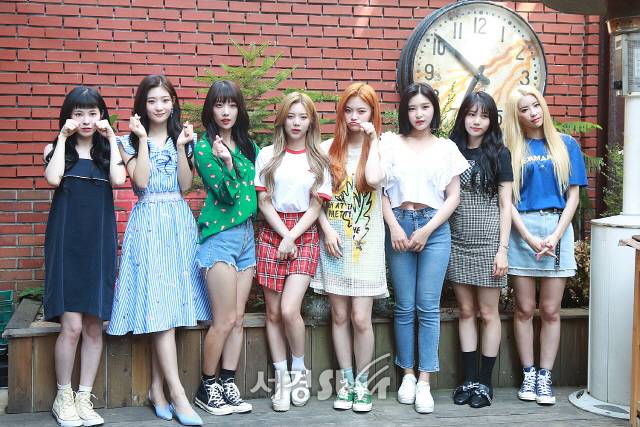 다이아(DIA) 멤버 예빈, 채연, 유니스, 은채, 솜이, 제니, 주은, 기희현이 인터뷰를 갖기 전 포즈를 취하고 있다.