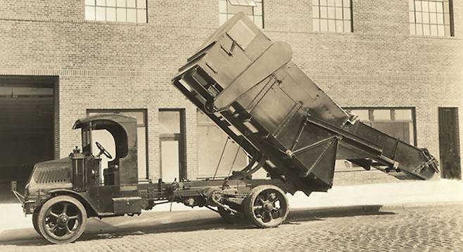 이 초기 쓰레기 덤프트럭의 어려움은 쓰레기를 수거하는 미화원들이 쓰레기를 어깨 높이까지 들어 올려야하는 것이었다. 이 문제를 해결하기 위해 1929년에 개발 된 첫 번째 기술은 쓰레기를 뒤쪽에서 싣는 나선형 스크류가 뒤에 설치된 둥근 쓰레기 적재함으로 개조됐다. 이것도 번거롭고 제작비가 많이 들어 1931년에는 더 효율적인 쓰레기 적제함 뒤에 설치되어 페기물을 담아 상하로 작동하는 덤프식 호퍼가 개발되어 폐기물을 케이블 시스템을 이용 트럭으로 보다 쉽게 끌어 올릴 수 있게됐다.