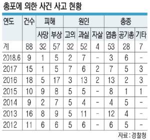 문제는 총기 사건이 증가세에 있다는 점이다. 연도별 총기 사건·사고를 보면 2012년 11건, 2013년 13건에서 2014년 9건으로 줄었다가 2015년 10건, 2016년 18건으로 다시 증가했다. 2017년엔 15건이었고, 올해는 상반기에만 9건이 발생했다. 봉화 총기 사건이 터지면서 4년 연속 두 자릿수 총기 사건 발생 기록을 이어가게 됐다. 종별로는 김 씨의 사례와 같은 엽총이 53건으로 가장 많았고, 공기총 28건, 기타 7건이었다. 원인별로는 오발 사고가 52건으로 1위였지만, 고의도 32건이나 됐다. 자살은 4건으로 집계됐다.