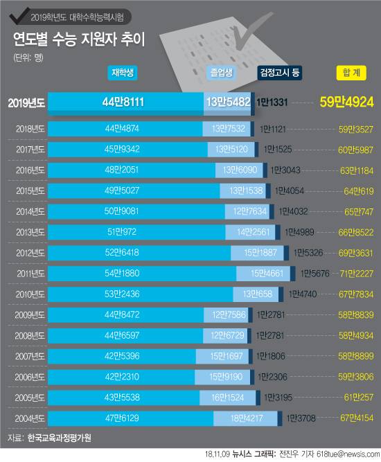 오는 15일 치러지는 2019학년도 대학수학능력시험 응시원서 접수자 수는 지난해 보다 1397명 증가한 59만4924명이다.
