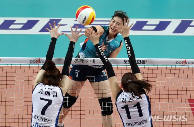 【서울=뉴시스】조성봉 기자 = 5일 오후 서울 중구 장충체육관에서 열린 도드람 2018-2019 V리그 여자부 GS칼텍스-IBK기업은행의 경기에서 GS칼텍스 이소영이 IBK 기업은행 고예림과 김수지의 블로킹을 피해 스파이크를 날리고 있다. 2018.12.05.