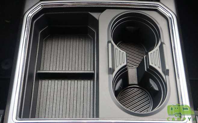 슈퍼듀티의 앞좌석 플로어콘솔에는 무려 4구의 컵홀더가 존재한다. 정확히는 2개의 컵홀더와 함께, 컵홀터 형상의 슬라이딩 커버를 이용하여 운전석 측의 수납공간을 컵홀더로 변신시키는 형태다. 하나하나 거대한 사이즈 덕에 패스트푸드점의 대형 음료 용기나 커피전문점의 대용량 커피 4잔도 문제 없다. 이렇게 거대한 컵홀더를 구비할 수 있게 된 데에는 차 자체의 거대한 폭, 그리고 스티어링 컬럼에 장착된 변속레버 덕분이다.