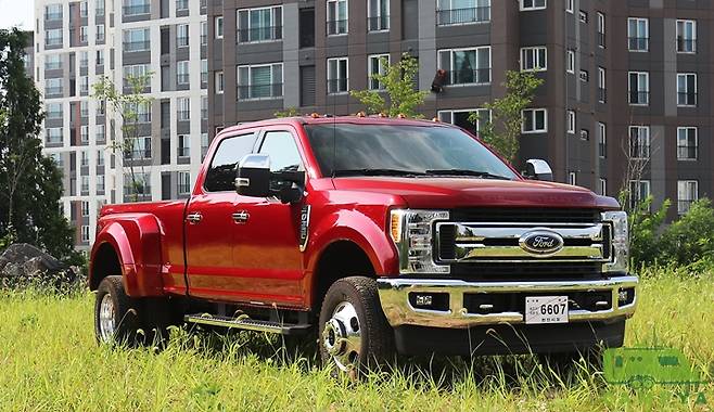 시승한 F-350 슈퍼듀티는 복륜(Dual Rear Wheel, DRW) 사양으로, 뒷바퀴가 바깥으로 불쑥 튀어 나와 있다. 그리고 이를 덮기 위해 적재함 측면의 휀더도 덩달아 튀어 나와 있어, 가뜩이나 큰 덩치를 더 커보이게 만든다. 번쩍 들어 올려진 차체 때문에 타이어와 휠 아치 사이는 사람의 머리도 들어갈 수 있을 만큼 크게 벌어져 있다. 최저지상고는 약 198mm에 달한다.