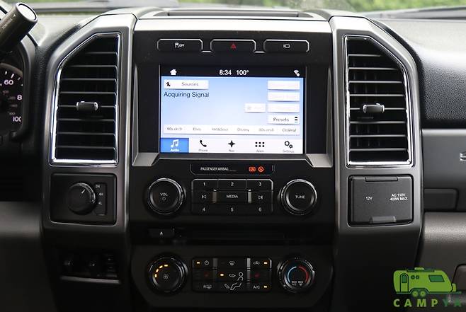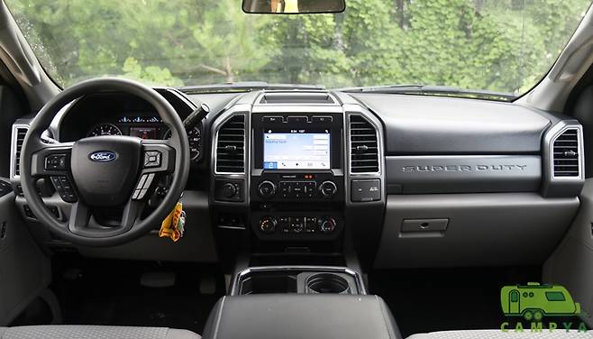 우리 캠핑에서 만난 F-350 슈퍼듀티는 크루캡 사양에 6.2리터 V8 가솔린 엔진을 탑재하고 사륜구동 시스템과 복륜 뒷바퀴까지 적용된 모델로, 최대 견인중량은 12,100파운드(약 5,488kg)에 달한다. 이는 기본 사양인 3.73의 종감속비가 적용되었을 때를 기준으로 한 것으로, 옵션으로 마련되는 종감속비 4.30의 리어 액슬을 선택하면 견인중량은 15,600파운드(약 7,076kg)까지 늘어난다. 시승한 차량만으로도 고중량으로 유명한 미국제 카라반들 대부분을 견인할 수 있을 뿐만 아니라, 30피트 내외의 크루즈 보트도 견인할 수 있다.