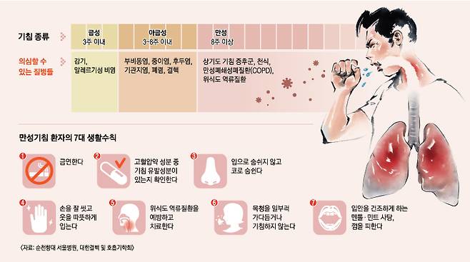 기침의 원인을 구분하는 가장 기본적인 기준은 ‘기간’입니다. 기침은 보통 기간에 따라 급성, 아급성(급성과 만성의 중간), 만성 등 세가지로 나눕니다. 어수택 순천향대서울병원 호흡기내과 교수는 9일 “급성 기침은 3주 이내, 아급성은 3~8주 이내, 만성 기침은 8주 이상으로 나눈다”고 설명했습니다. 여기서 중요한 것은 ‘만성 기침’입니다. 어 교수는 “아급성, 만성 기침은 단순히 기침 멎는 약을 먹고 상태가 좋아졌다고 안심해서는 안 된다”며 “반드시 원인을 찾아야 하고 초기 치료가 늦어 낭패를 보는 사례가 많다”고 지적했습니다.