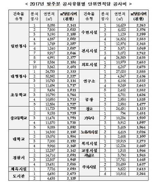 공사비 분석 자료에 따르면 단위면적(㎡)당 공사비는 분석대상 전체(20개 유형 및 67건 공사) 평균치가 ㎡당 213만원으로 분석됐다.